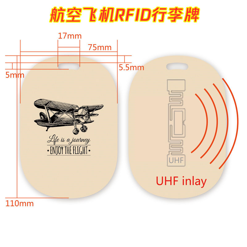 UHF RFID航空飞机行李吊牌参数: 芯片型号: Alien H3、UCODE8、lmpinj Monza R6P、lmpinj Monza 4QT产品尺寸: 110*75*0.88mm (可定制尺寸)表面材质: PVC/PET通信协议: ISO/IEC18000-6C工作频率: 超高频860-960MHz感应距离: 1-12M(跟读卡器功率大小和产品尺寸有关)内存容量: EPC96-480bit,USER512 (跟芯片有关)储存温度: -40°至50°工作温度: -40°至65°数据保存: 大于10…